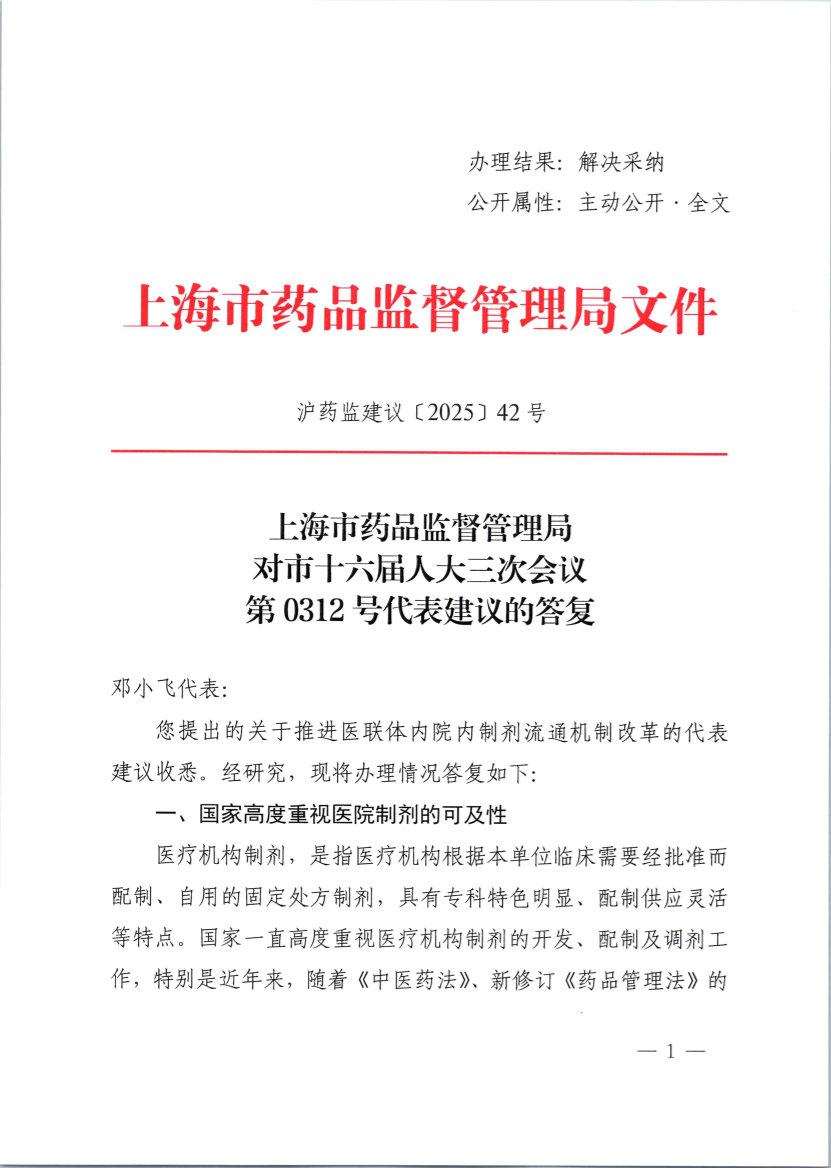 您提出的关于推进医联体内院内制剂流通机制改革的代表建议收悉。经研究,现将办理情况答复如下: