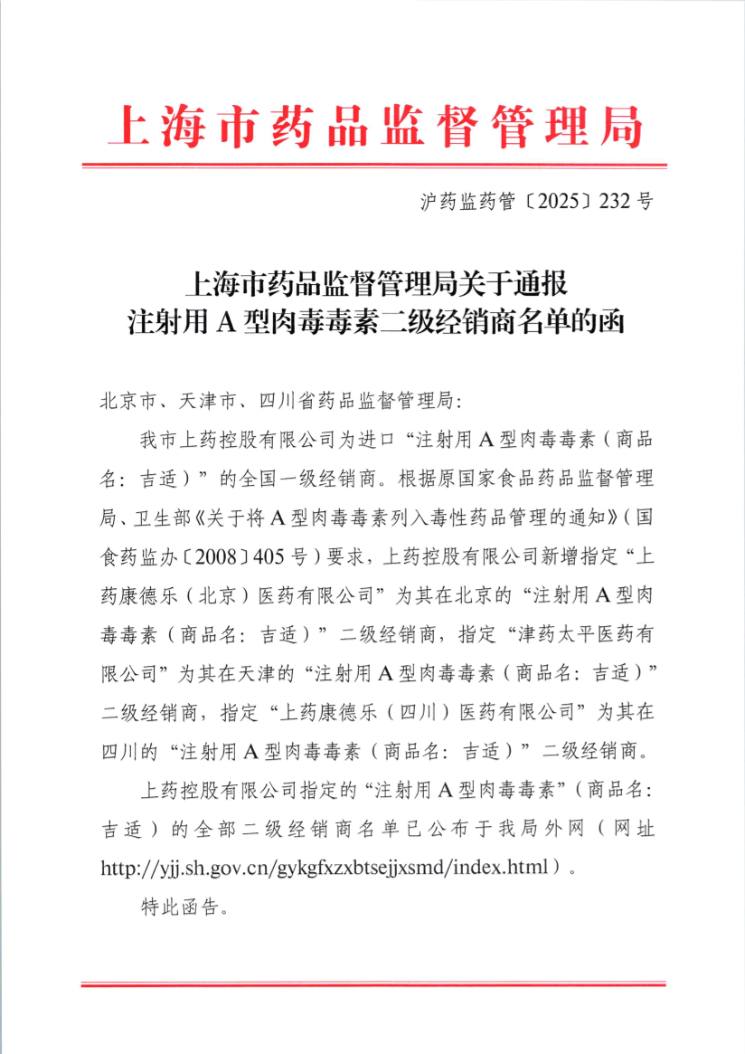 我市上药控股有限公司为进口“注射用A型肉毒毒素(商品名:吉适)”的全国一级经销商。根据原国家食品药品监督管理局、卫生部《关于将A型肉毒毒素列入毒性药品管理的通知》(国食药监办〔2008〕405号)要求,上药控股有限公司新增指定“上药康德乐(北京)医药有限公司”为其在北京的“注射用A型肉毒毒素(商品名:吉适)”二级经销商,指定“津药太平医药有限公司”为其在天津的“注射用A型肉毒毒素(商品名:吉适)”二级经销商,指定“上药康德乐(四川)医药有限公司”为其在四川的“注射用A型肉毒毒素(商品名:吉适)”二级经销商。